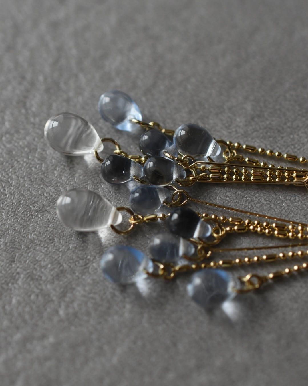 3色の透明感のあふれる、大小のドロップビーズ